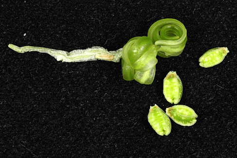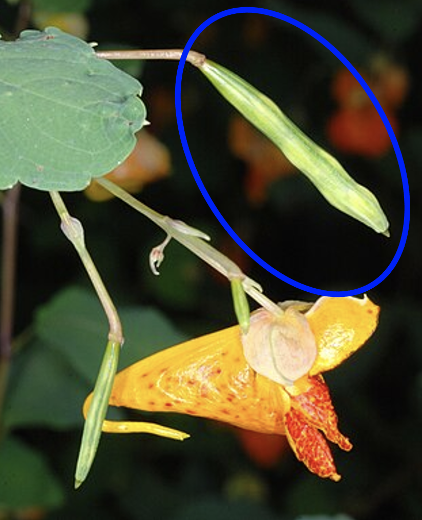Now that I am older, and majoring in ecology, I have a greater interest in the actual science of this plant. I have learned that the explosion is not just a fun phenomenon. It is actually a reproductive strategy, termed ballistic seed dispersal, and it is used by many plant species. Using force to shoot seeds significant distances, as opposed to dropping them with gravity, increases the range at which an offspring can establish itself. When individual offspring are able to grow further from their parents, they escape having to compete for resources, and the population as a whole can increase its range, too. Thus, ballistic seed dispersal is considered to be an evolutionary adaptation. It is made possible by the storage of mechanical energy in tissues of the seed pod, which is circled in blue in the photo to the right. Each seed pod is made up of five different sections of one tissue type. These sections are called valves, and they are where the mechanical energy is stored. When the seed pod is disturbed, by touch or some other movement, the valves split from each other. After splitting, the valves coil in on themselves at high speeds. This rapid coiling transfers kinetic energy to the seeds, propelling them away from the plant. The process takes less than one hundredth of a second and can send seeds farther than five feet! The split and coiled seed pod and its seeds can be seen in the photo below.